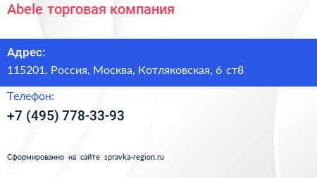 Abele, торговая компания по адресу 115201, Россия, Москва, Котляковская, 6 ст8 в дальнейшем Организация, размещена в следующих категориях: