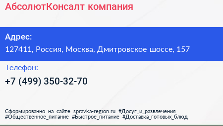 АбсолютКонсалт, компания по адресу 127411, Россия, Москва, Дмитровское шоссе, 157 в дальнейшем Организация, размещена в следующих категориях:
