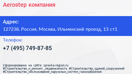 Aerostep, компания по адресу 127238, Россия, Москва, Ильменский проезд, 13 ст1 в дальнейшем Организация, размещена в следующих категориях: