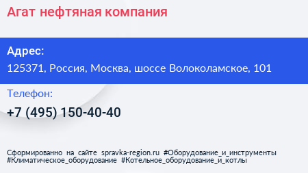 Агат, нефтяная компания по адресу 125371, Россия, Москва, шоссе Волоколамское, 101 в дальнейшем Организация, размещена в следующих категориях: