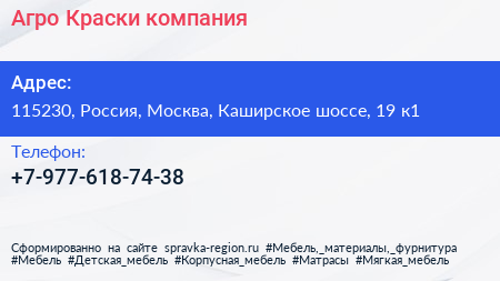 Агро Краски, компания по адресу 115230, Россия, Москва, Каширское шоссе, 19 к1 в дальнейшем Организация, размещена в следующих категориях: