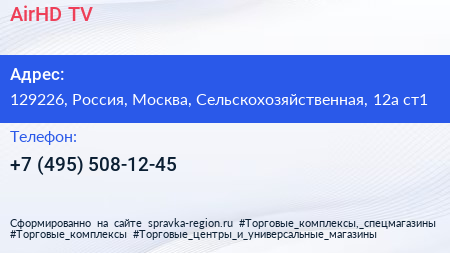AirHD.TV по адресу 129226, Россия, Москва, Сельскохозяйственная, 12а ст1 в дальнейшем Организация, размещена в следующих категориях: