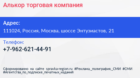 Алькор, торговая компания по адресу 111024, Россия, Москва, шоссе Энтузиастов, 21 в дальнейшем Организация, размещена в следующих категориях: