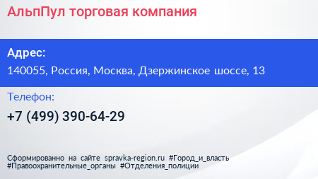 АльпПул, торговая компания по адресу 140055, Россия, Москва, Дзержинское шоссе, 13 в дальнейшем Организация, размещена в следующих категориях: