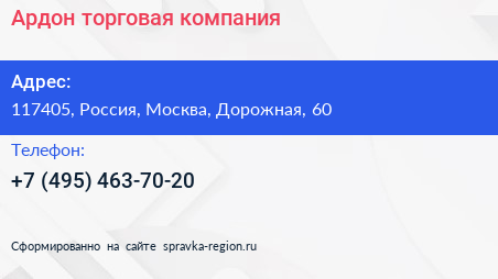 Ардон, торговая компания по адресу 117405, Россия, Москва, Дорожная, 60 в дальнейшем Организация, размещена в следующих категориях: