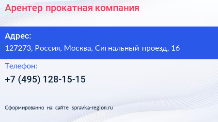 Арентер, прокатная компания по адресу 127273, Россия, Москва, Сигнальный проезд, 16 в дальнейшем Организация, размещена в следующих категориях: