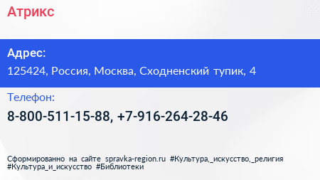 Атрикс по адресу 125424, Россия, Москва, Сходненский тупик, 4 в дальнейшем Организация, размещена в следующих категориях: