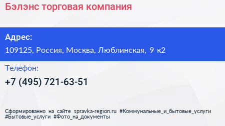 Бэлэнс, торговая компания по адресу 109125, Россия, Москва, Люблинская, 9 к2 в дальнейшем Организация, размещена в следующих категориях: