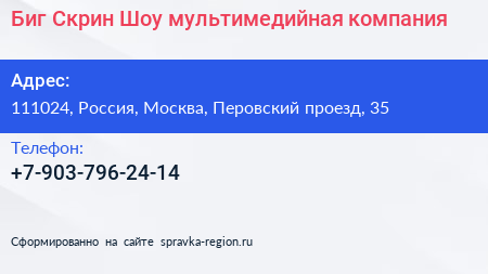 Биг Скрин Шоу, мультимедийная компания по адресу 111024, Россия, Москва, Перовский проезд, 35 в дальнейшем Организация, размещена в следующих категориях: