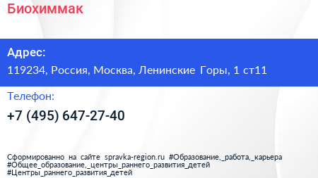 Биохиммак по адресу 119234, Россия, Москва, Ленинские Горы, 1 ст11 в дальнейшем Организация, размещена в следующих категориях: