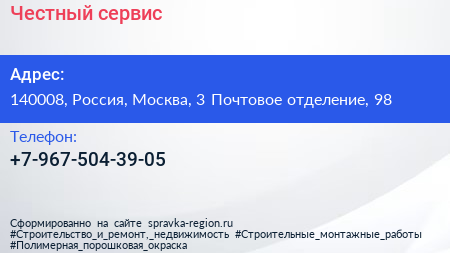 Честный сервис по адресу 140008, Россия, Москва, 3 Почтовое отделение, 98 в дальнейшем Организация, размещена в следующих категориях: