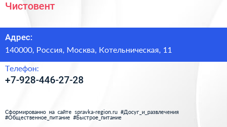 Чистовент по адресу 140000, Россия, Москва, Котельническая, 11 в дальнейшем Организация, размещена в следующих категориях: