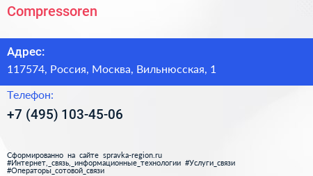 Compressoren по адресу 117574, Россия, Москва, Вильнюсская, 1 в дальнейшем Организация, размещена в следующих категориях: