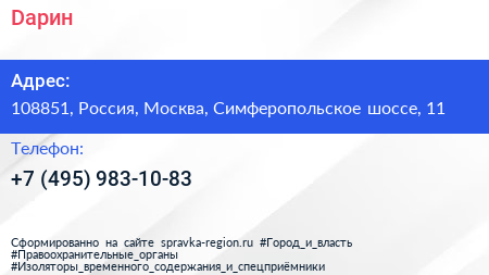 Dарин по адресу 108851, Россия, Москва, Симферопольское шоссе, 11 в дальнейшем Организация, размещена в следующих категориях: