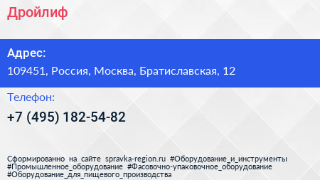 Дройлиф по адресу 109451, Россия, Москва, Братиславская, 12 в дальнейшем Организация, размещена в следующих категориях: