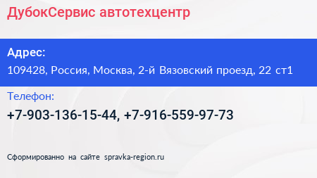 ДубокСервис, автотехцентр по адресу 109428, Россия, Москва, 2-й Вязовский проезд, 22 ст1 в дальнейшем Организация, размещена в следующих категориях: