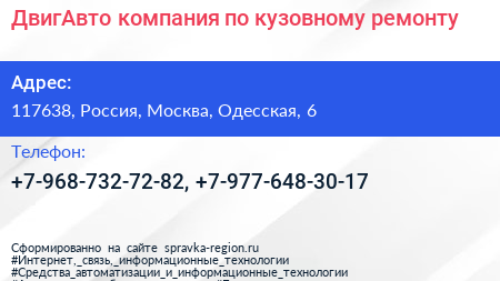 ДвигАвто, компания по кузовному ремонту по адресу 117638, Россия, Москва, Одесская, 6 в дальнейшем Организация, размещена в следующих категориях: