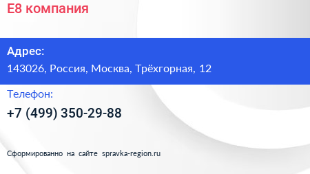 Е8, компания по адресу 143026, Россия, Москва, Трёхгорная, 12 в дальнейшем Организация, размещена в следующих категориях: