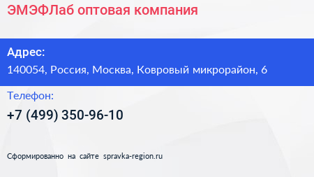 ЭМЭФЛаб, оптовая компания по адресу 140054, Россия, Москва, Ковровый микрорайон, 6 в дальнейшем Организация, размещена в следующих категориях: