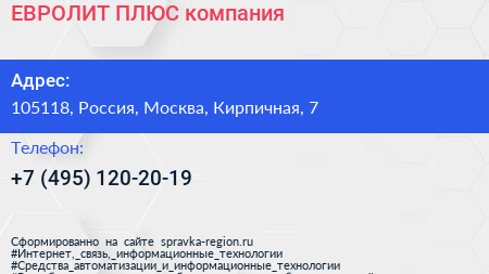 ЕВРОЛИТ ПЛЮС, компания по адресу 105118, Россия, Москва, Кирпичная, 7 в дальнейшем Организация, размещена в следующих категориях: