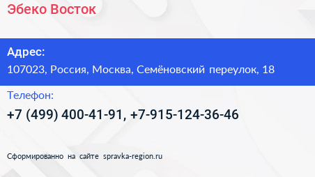 Эбеко-Восток по адресу 107023, Россия, Москва, Семёновский переулок, 18 в дальнейшем Организация, размещена в следующих категориях:
