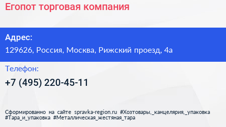 Егопот, торговая компания по адресу 129626, Россия, Москва, Рижский проезд, 4а в дальнейшем Организация, размещена в следующих категориях: