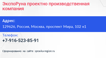 ЭкспоРуна, проектно-производственная компания по адресу 129626, Россия, Москва, проспект Мира, 102 к1 в дальнейшем Организация, размещена в следующих категориях: