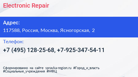 Electronic Repair по адресу 117588, Россия, Москва, Ясногорская, 2 в дальнейшем Организация, размещена в следующих категориях: