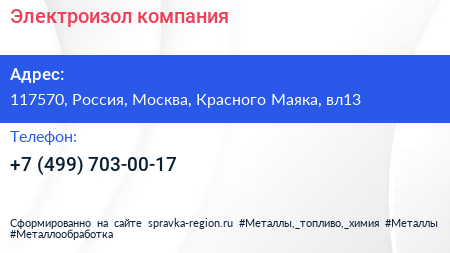 Электроизол, компания по адресу 117570, Россия, Москва, Красного Маяка, вл13 в дальнейшем Организация, размещена в следующих категориях: