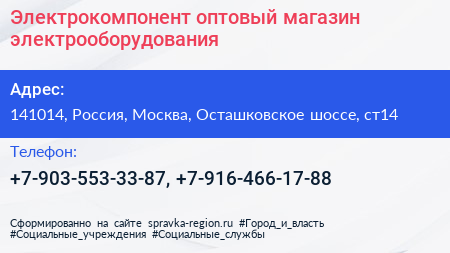 Электрокомпонент, оптовый магазин электрооборудования по адресу 141014, Россия, Москва, Осташковское шоссе, ст14 в дальнейшем Организация, размещена в следующих категориях: