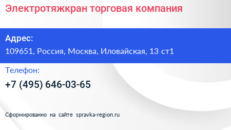 Электротяжкран, торговая компания по адресу 109651, Россия, Москва, Иловайская, 13 ст1 в дальнейшем Организация, размещена в следующих категориях: