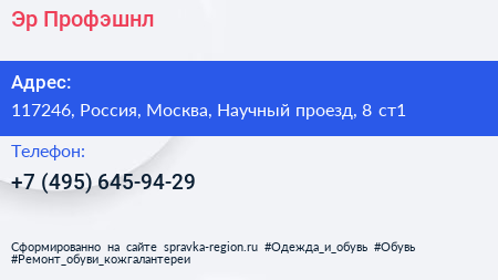 Эр Профэшнл по адресу 117246, Россия, Москва, Научный проезд, 8 ст1 в дальнейшем Организация, размещена в следующих категориях: