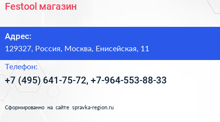 Festool, магазин по адресу 129327, Россия, Москва, Енисейская, 11 в дальнейшем Организация, размещена в следующих категориях: