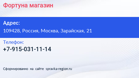 Фортуна, магазин по адресу 109428, Россия, Москва, Зарайская, 21 в дальнейшем Организация, размещена в следующих категориях: