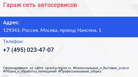 Гараж, сеть автосервисов по адресу 129343, Россия, Москва, проезд Нансена, 1 в дальнейшем Организация, размещена в следующих категориях: