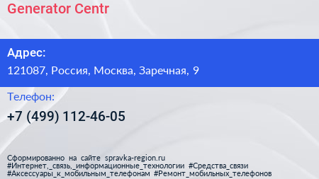 Generator-Centr по адресу 121087, Россия, Москва, Заречная, 9 в дальнейшем Организация, размещена в следующих категориях: