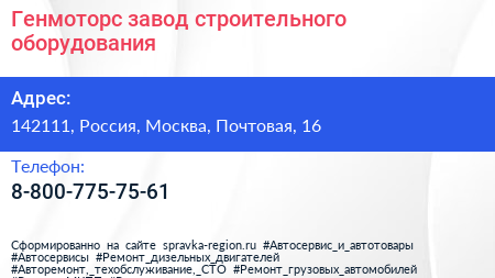 Генмоторс, завод строительного оборудования по адресу 142111, Россия, Москва, Почтовая, 16 в дальнейшем Организация, размещена в следующих категориях: