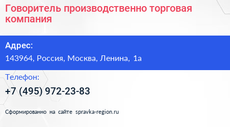 Говоритель, производственно-торговая компания по адресу 143964, Россия, Москва, Ленина, 1а в дальнейшем Организация, размещена в следующих категориях: