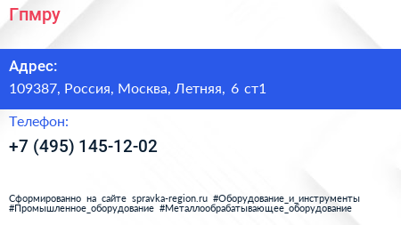 Гпмру по адресу 109387, Россия, Москва, Летняя, 6 ст1 в дальнейшем Организация, размещена в следующих категориях: