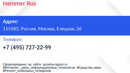 Hammer Rus по адресу 115583, Россия, Москва, Елецкая, 26 в дальнейшем Организация, размещена в следующих категориях: