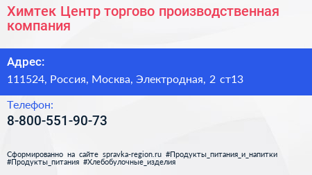 Химтек-Центр, торгово-производственная компания по адресу 111524, Россия, Москва, Электродная, 2 ст13 в дальнейшем Организация, размещена в следующих категориях: