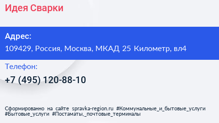 Идея Сварки по адресу 109429, Россия, Москва, МКАД 25 Километр, вл4 в дальнейшем Организация, размещена в следующих категориях: