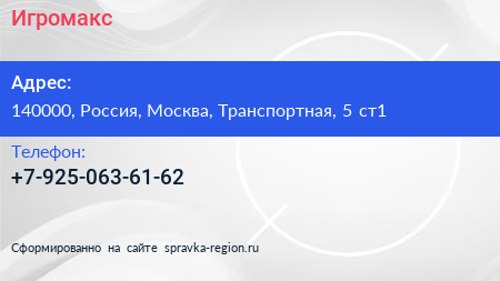 Игромакс по адресу 140000, Россия, Москва, Транспортная, 5 ст1 в дальнейшем Организация, размещена в следующих категориях: