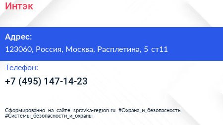 Интэк по адресу 123060, Россия, Москва, Расплетина, 5 ст11 в дальнейшем Организация, размещена в следующих категориях: