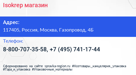 Isokrep, магазин по адресу 117405, Россия, Москва, Газопровод, 4Б в дальнейшем Организация, размещена в следующих категориях: