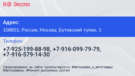 КФ Экспо по адресу 108851, Россия, Москва, Бутовский тупик, 1 в дальнейшем Организация, размещена в следующих категориях: