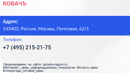КОВАЧЪ по адресу 143402, Россия, Москва, Почтовая, 62/1 в дальнейшем Организация, размещена в следующих категориях:
