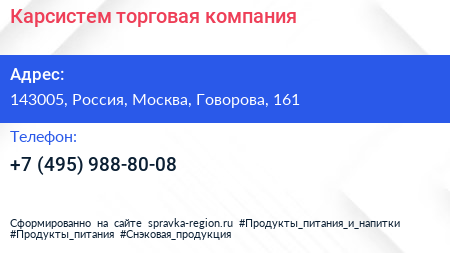 Карсистем, торговая компания по адресу 143005, Россия, Москва, Говорова, 161 в дальнейшем Организация, размещена в следующих категориях: