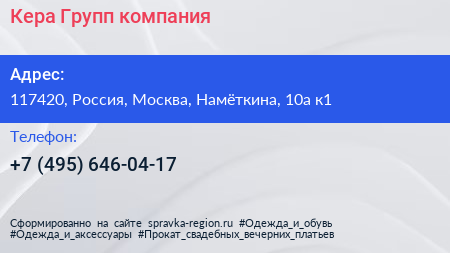 Кера Групп, компания по адресу 117420, Россия, Москва, Намёткина, 10а к1 в дальнейшем Организация, размещена в следующих категориях: