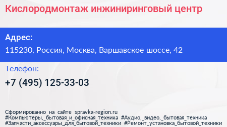 Кислородмонтаж, инжиниринговый центр по адресу 115230, Россия, Москва, Варшавское шоссе, 42 в дальнейшем Организация, размещена в следующих категориях:
